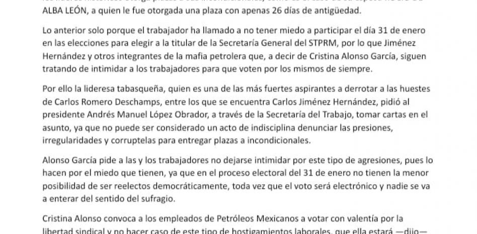 «Jiménez Hernández y otros integrantes de la mafia petrolera siguen tratando de intimidar a los trabajadores para que voten por los mismos de siempre», señaló Cristina Alonso, quien es considerada una de las más fuertes aspirantes a derrotar a los aliados de Carlos Romero Deschamps, exlíder petrolero, entre ellos Carlos Jiménez Hernández.