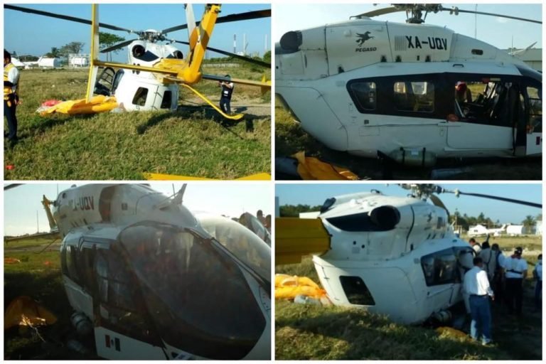Un helicóptero de la compañía “Pegaso” con matrícula “XA-UQV” se desplomó de unos 10 metros de altura en inmediaciones del puerto de Dos Bocas, Paraíso, Tabasco.