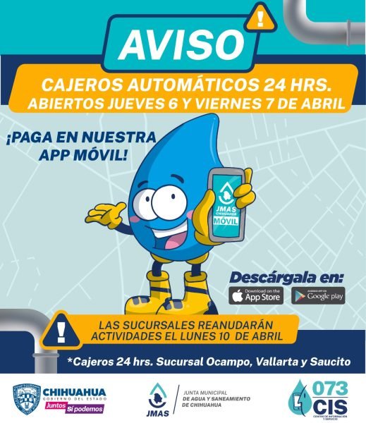 Los días del 6 al 8 de abril la Junta Municipal de Agua y Saneamiento (JMAS) de Chihuahua informó que las oficinas permanecerán cerradas con motivo de Semana Santa, sin embargo, los cajeros automáticos de las sucursales Ocampo, Vallarta y Saucito operarán las 24 horas para comodidad de los usuarios.